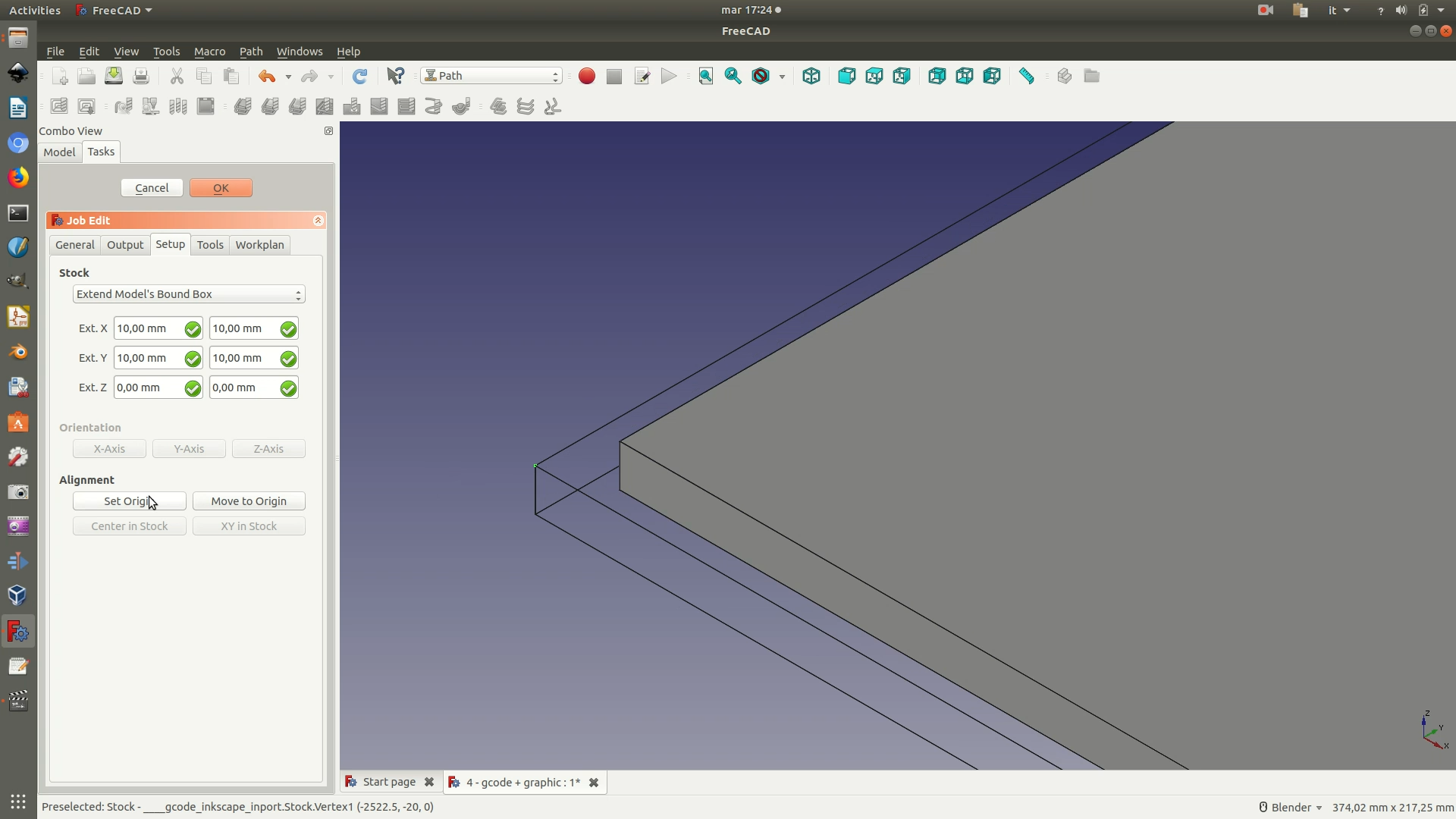 The rectangle is called “stock” and it represents the area of space from which the shape will be carved out or engraved. At the same time, a new selection panel on the left sidebar has appeared. In this panel, you need to set the size of the margins you want to apply around your shape. The boundaries of the shape plus these margins define the size of the stock. In this case, we apply a margin of 10mm on both the X axis and Y axis. For the Z axis, on the other hand, we apply a margin of 0 mm. This way, the machine will cut all the way to the bottom of the sheet of wood. Once you have defined to stock, you need to define the origin point of the machine’s movements. With your mouse, select the bottom left corner of the stock and click on the command Set Origin from the left selection panel. If this has been carried out correctly, you will notice that the Cartesian plane with the red, green and blue arrows has moved so that its origin corresponds to the corner you have just set as the origin. See image below for clarification.