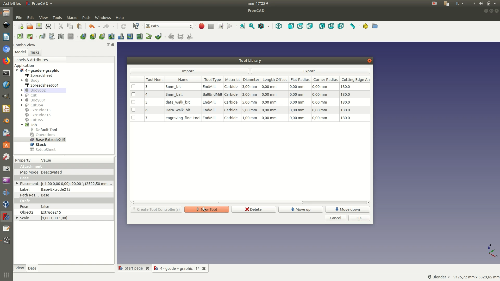 7. At this point, you have to declare what type of milling tool you are going to use to perform the cutting operation. Go through the menu Path > Tool Manager. A pop-up window will appear, with a tool library containing information on several milling tools their technical characteristics. Note that this library is build manually and gradually, as you add new tools you need to work with. In your case, thus, it is likely that the pop-up window will show you an empty library. To add a new tool to the library, click on New Tool. You will be promoted with a form that allows you to define the specs of the tool you will be using and add it to your tool library. For this project, you will need to define a milling tool that has at least the following specs: a type of EndMill and a diameter of 3mm, as shown in the last of the following images. Clicking on OK will add this tool to your tool library. Once the tool has been added to the library, mark the corresponding box in the tool library and click on Create Tool Controller(s). This way, the specified tool will be exported along with the other path instructions and will be used by the milling machine for its cutting task.