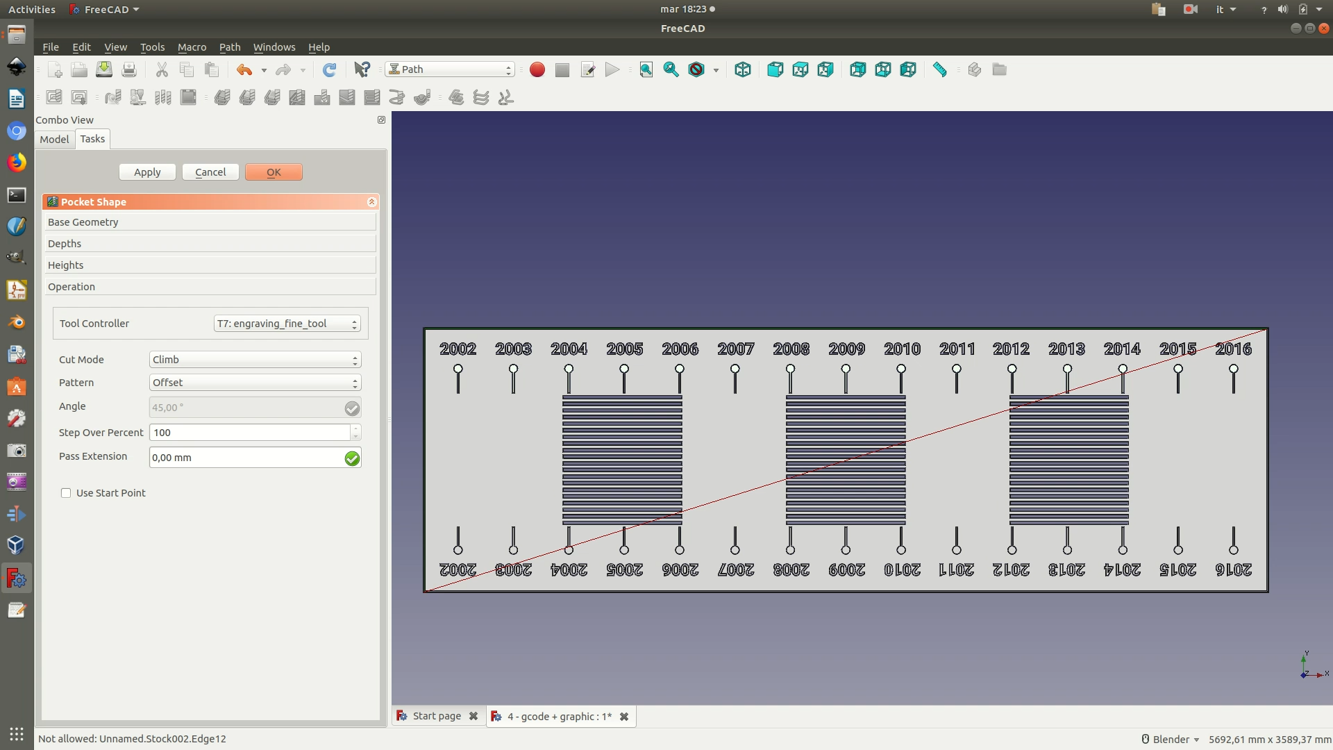 12. From the base, select all the lines representing the object’s x axis ticks and click through the menu Path > Pocket Shape. On the left selection panel, leave all options with the default values, except for Pattern, where you should select Offset. The axis ticks should now have turned green. Repeat this step also for all the text that needs to be engraved (in this case, only the x axis tick labels, with the years). If you have a good CPU, you could also select and pocket all the text and graphics elements in one go.