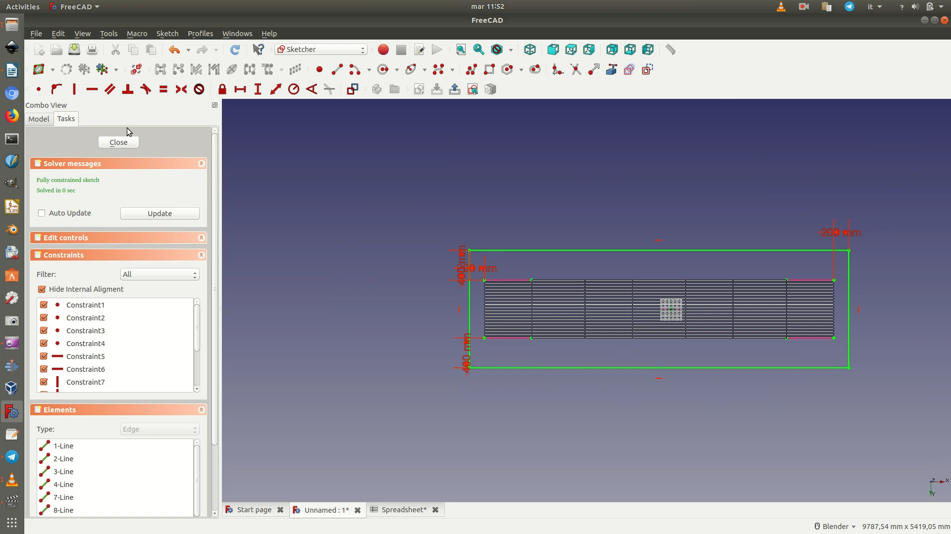 Now move on to select the bottom right corner of the rectangle and the rightmost point of the bottom right pink projection segment. On these two points apply the same constraints as before, a Horizontal Distance Constraint of 200mm and a Vertical Distance Constraint of 400mm. Now close the sketch.