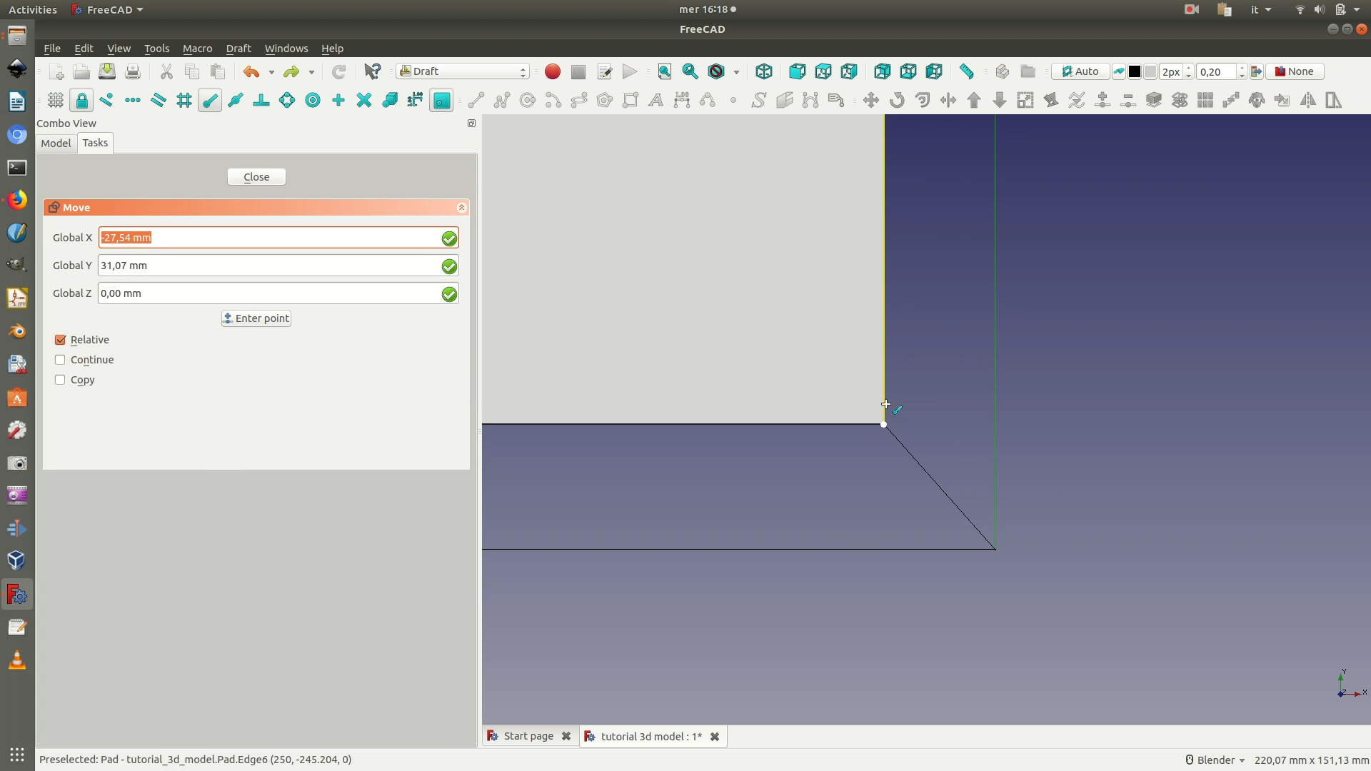 8. Move the imported vectors on top of the square base you have previously modeled. To do so, switch to the Draft Workbench and select the top view by going through View > Standard Views > Top. Select all the elements that are part of the imported .SVG by selecting all of them on the left sidebar pane (see image below). Move them by clicking through the menu Draft > Move. On the panel that has appeared on the left, make sure you deselect the Copy option. You will then define the movement of all the selected elements by choosing (clicking) the starting point and ending point of the movement.