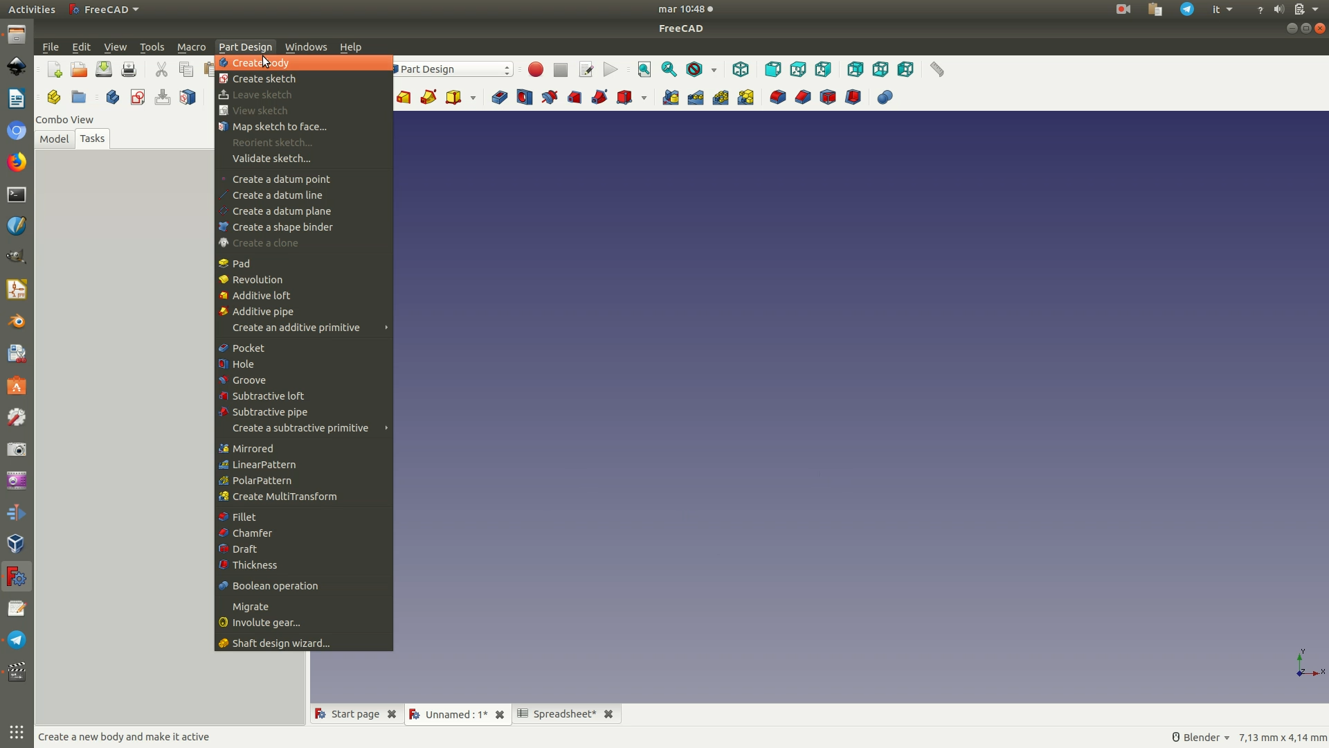 2. Create a new body (the container for your design) and a new sketch (the 2D drawing of your object). To do this, first click through the menu Part Design > Create Body, then through Part Design > Create Sketch.