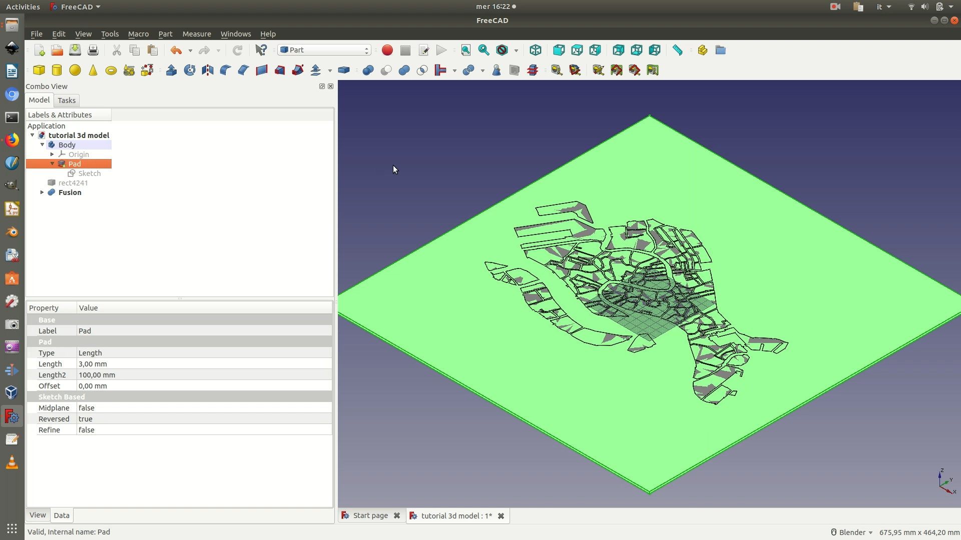 11. Unhide the padded square by selecting it on the left sidebar and right-clicking on Show selection. Now select both the Pad element and the Fusion element from the left sidebar, making sure that the Pad element is the first one you select. Go through Part > Boolean > Cut. Again, depending on your CPU and the complexity of the vector map, this process might take up even minutes. At the end of the operation, if you look at the left sidebar, you will notice that both the Pad element (the square) and the Fusion element (the map) have been grouped under a new Cut element.